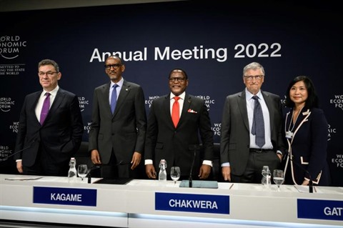 | (de gauche à droite) : le Pdg de Pfizer, Albert Bourla, le président rwandais Paul Kagamé, le président du Malawi Lazarus Chakwera, le co-fondateur de Microsoft Bill Gates et la présidente du groupe Pfizer Angela Hwang, le 25 mai à Davos, en Suisse. |