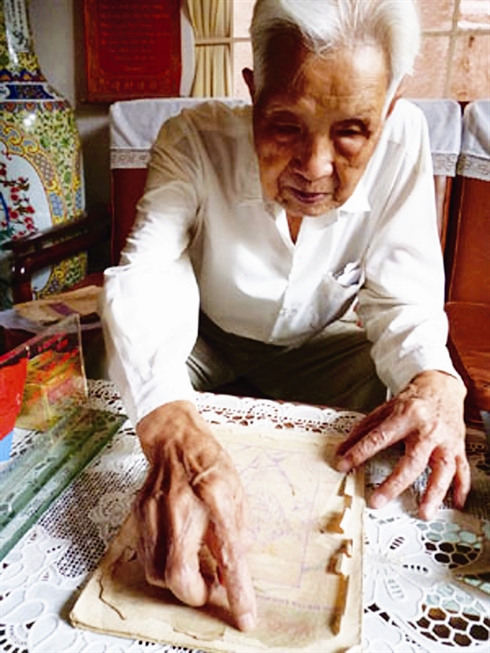 | Le nonagénaire Kiêu Xuân Cu montre certaines pages légèrement déchirées de la gazette Pha nguc datant de 1954 |