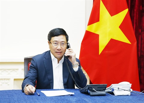 | Le vice-Premier ministre et ministre des Affaires étrangères, Pham Binh Minh en conversation téléphonique avec le ministre des Affaires étrangères de Malaisie, Saifuddin Abdullah, le 12 mars. |