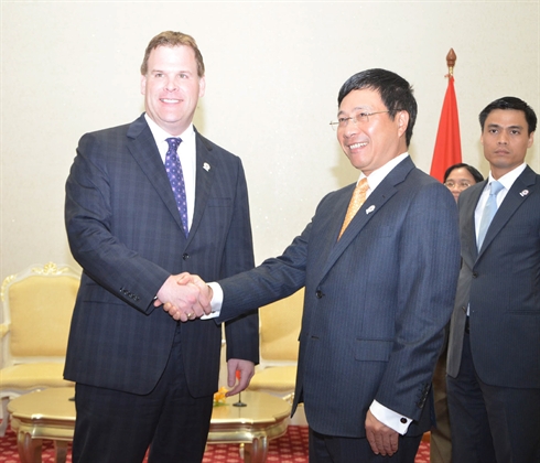 | Rencontre entre le ministre vietnamien des Affaires étrangères Pham Binh Minh (droite) et son homologue canadien John Baird, le 11 juillet à Phnom Penh. |
