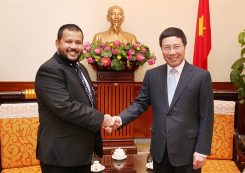 | Le vice-Premier ministre et ministre des Affaires étrangères, Pham Binh Minh (droite), et le ministre sri lankais de l'Industrie et du Commerce, Rishad Bathiudeen, |