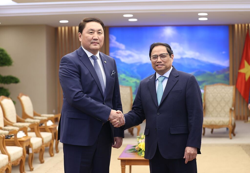 | Le chef du gouvernement vietnamien Pham Minh Chinh (droite) et le ministre mongol de la Défense, Saikhanbayar Gursed. |