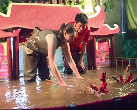 | La jeune française Blandine Lepage tente de manipuler des marionnettes sur l'eau. |