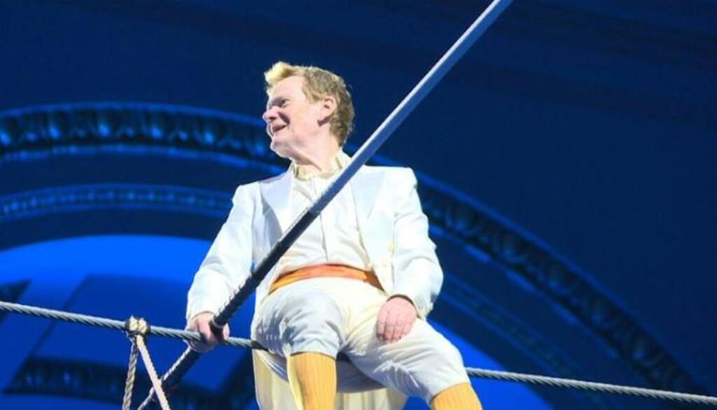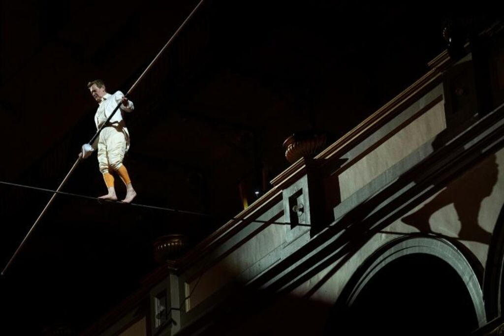Jeudi soir 23 mars, pour achever son spectacle, Philippe Petit a joué sa vie dans le noir, un fin rayon de lumière éclairant uniquement sa ligne au-dessus de la foule. Sur son balancier blanc, il porte huit longues bougies.