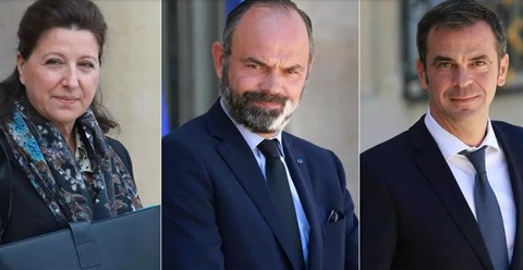 | Photomontage réalisé le 3 juillet 2020 de l'ex-ministre de la Santé Agnès Buzyn (29 janvier 2020), l'ex-Premier ministre Edouard Philippe (24 juin 2020) et de l'actuel ministre de la Santé Olivier Véran (24 juin 2020). |