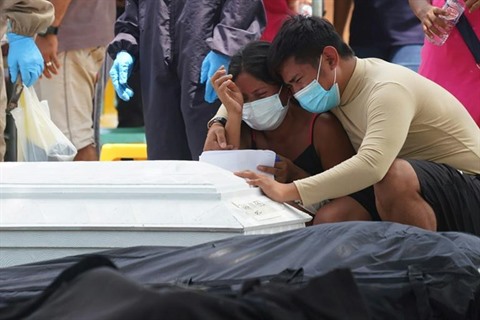 | Des habitants pleurent leurs proches décédés, dans le quartier de Pilar à Abuyog, le 14 avril |