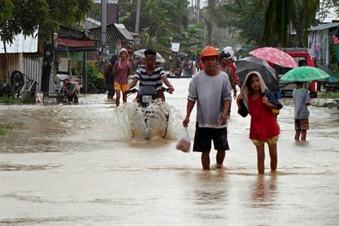 | Des passants dans une rue inondée d'Abuyog, aux Philippines, après le passage de la tempête Megi, le 11 avril. |