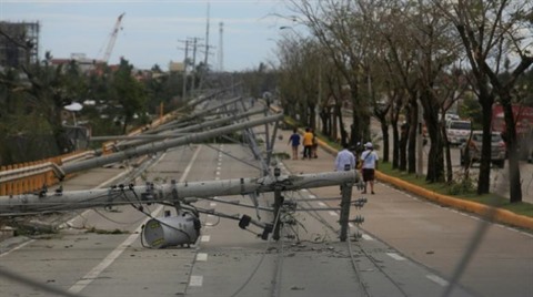 | Des poteaux électriques sur la chaussée, après le passage du typhon meurtrier Rai aux Philippines, le 17 décembre. |