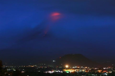 | Le cratère du volcan Mayon rougoie dans la nuit, le 15 janvier à Legazpi, aux Philippines. |