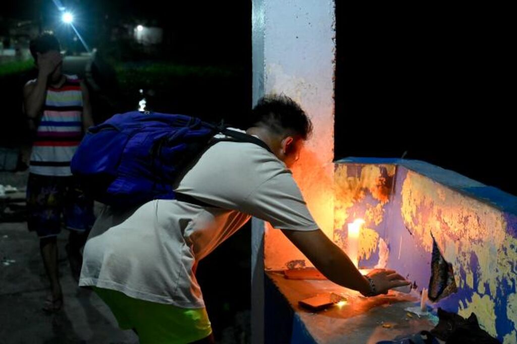 | Un homme allume une bougie pour les victimes du chavirement d'un bateau, le 27 juillet à Binangonan, aux Philippines. |