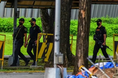 | Une patrouille de police sur les lieux d'une fusillade, à l'université de Manille, le 24 juillet. |
