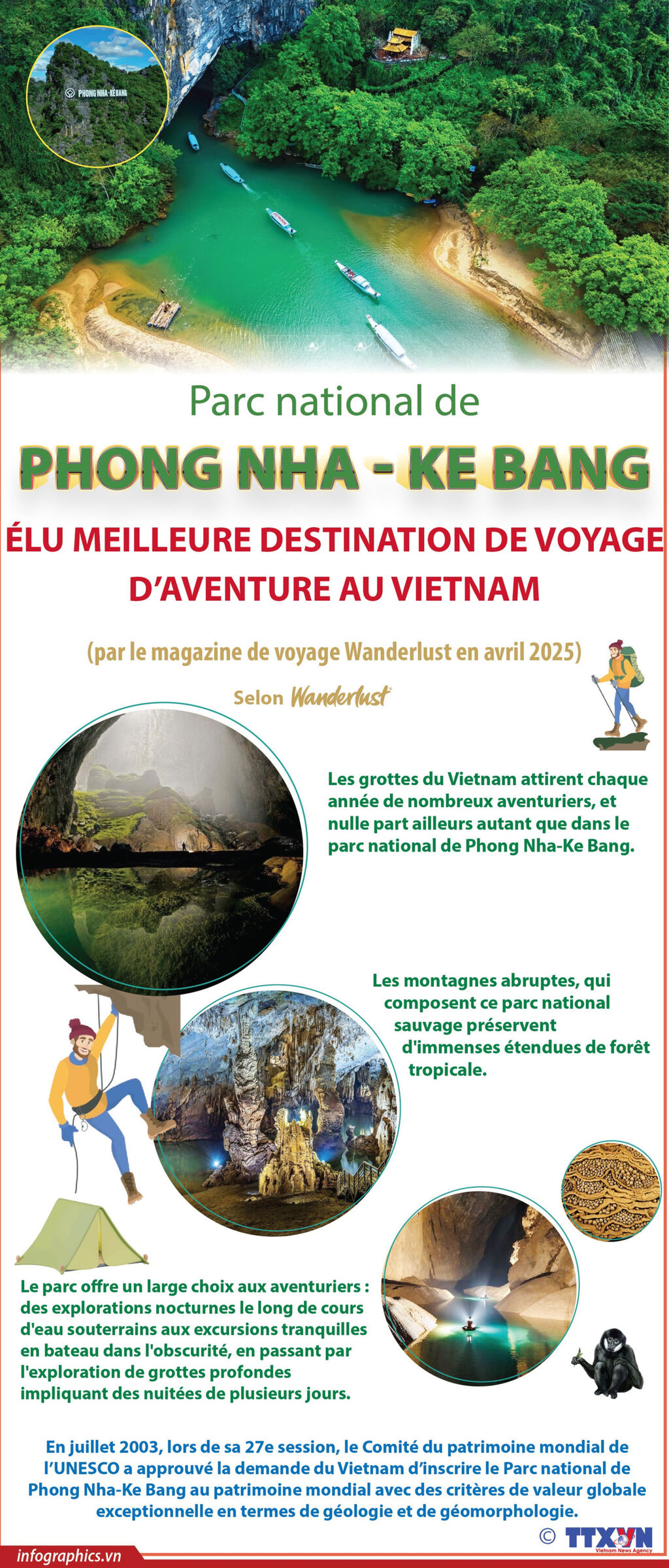 Selon le magazine de voyage britannique Wanderlust, le parc national de Phong Nha-Ke Bàng captive les amateurs d’aventure avec ses majestueux réseaux de grottes nichés au cœur de forêts vierges et de paysages naturels préservés, ainsi qu'avec son riche écosystème.
