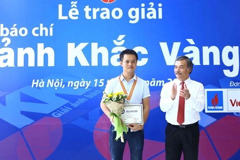 | Le directeur général adjoint de la VNA, Nguyên Hoài Duong (droite) lors cérémonie de remise des prix de la 4e édition du concours "Moments d'or", le 15 septembre à Hanoï. |