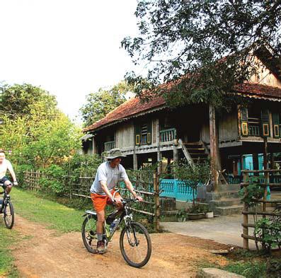 | Des touristes étrangers visitant les hameaux de Mai Châu, province de Hoà Binh. |