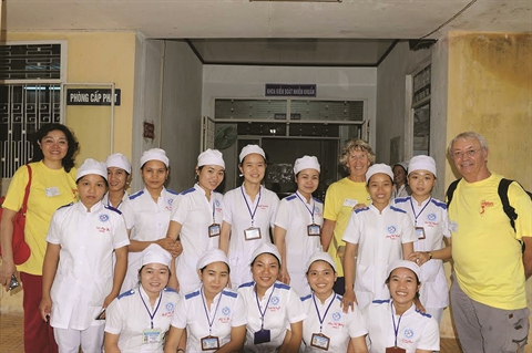 | Les élèves infirmières de la Polyclinique de Binh Duong entourées de médecins bénévoles d’AMPHORE. |