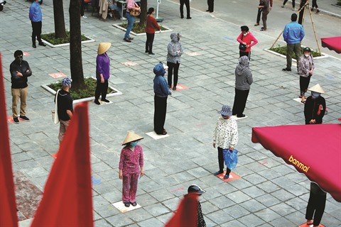 | Afin de respecter les mesures de sécurité, les gens font la queue à 2 m les uns des autres. Photo : An Thành Dat/VNA/CVN |