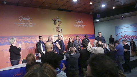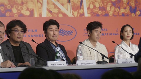 | Bong Joon Ho (gauche) réalisateur du film "Parasite" avec une partie de ses acteurs. |