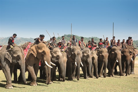 | Villageois faisant le tour de la cây nêu et dansant au rythme des gongs. |