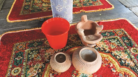 | La cuisine, le riz, le sel et la jarre d’eau préparés par le propriétaire. |