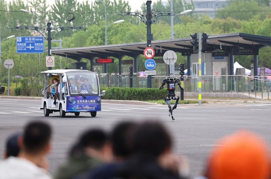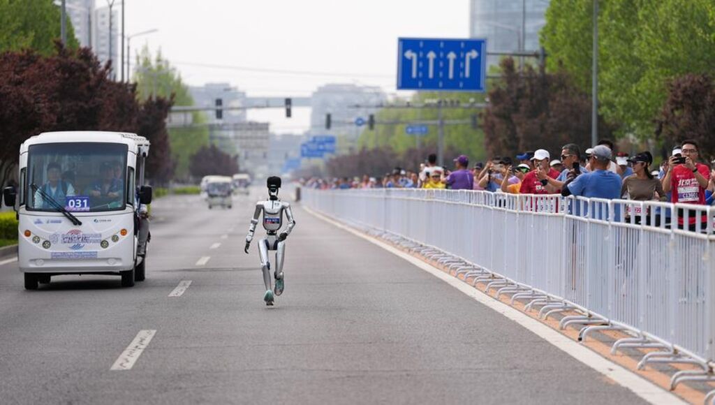 | Le robot humanoïde "Unitree H1" de l'équipe Hang U Sai, dans la catégorie autonome, court lors du semi-marathon de Beijing E-Town et du semi-marathon de robots humanoïdes. |
