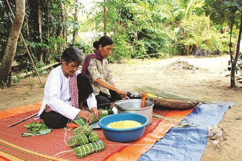 | Des Khmères de la commune de Dai Tâm, district de My Xuyên (Sóc Trang), préparent des bánh tét, gâteau traditionnel du Têt. |