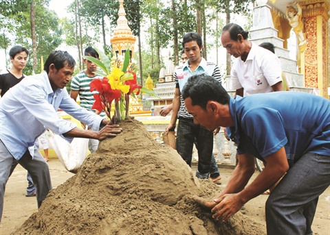 | Construction d’un petit tas de sable censé retirer les choses négatives de l’ancienne année. |
