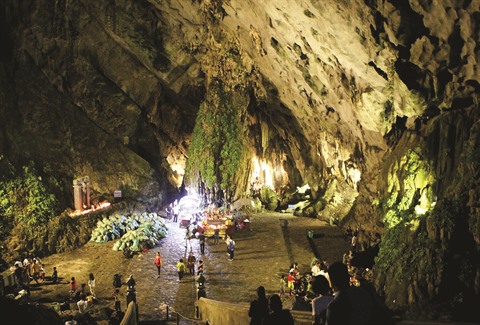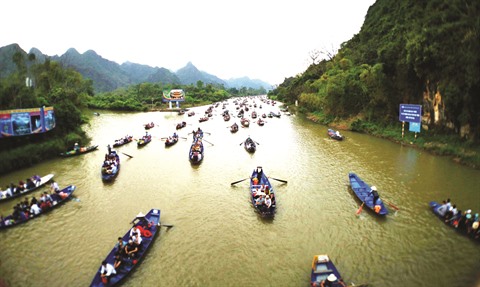 | Des touristes en barques sur la rivière Yên menant à la pagode des Parfums. |