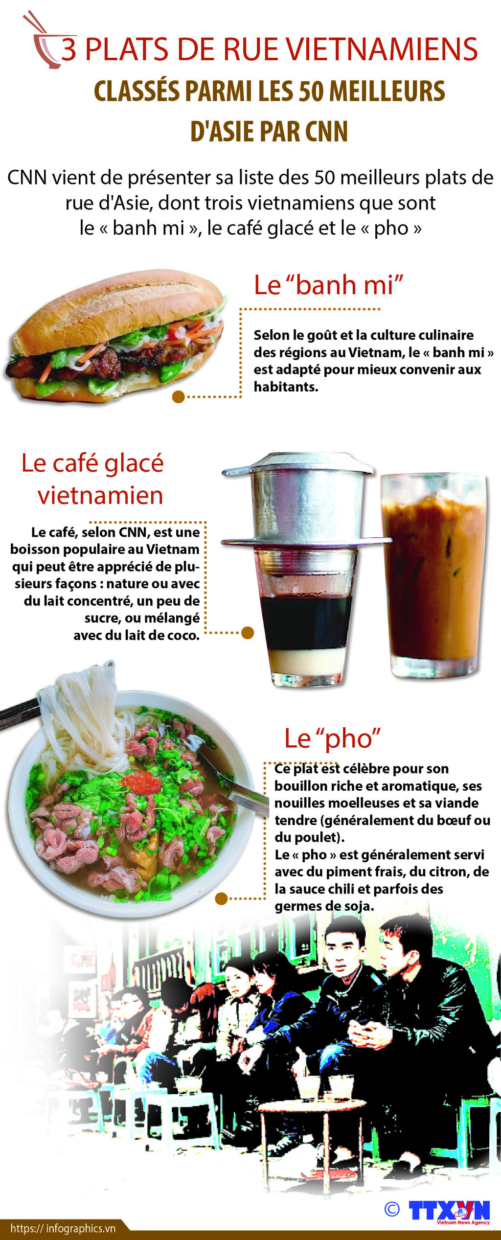 Le pho (soupe de nouilles au bœuf ou poulet), le banh mi (sandwich à la vietnamienne), et le café font partie des meilleurs plats de rue asiatiques récemment élus par la chaîne américain CNN.