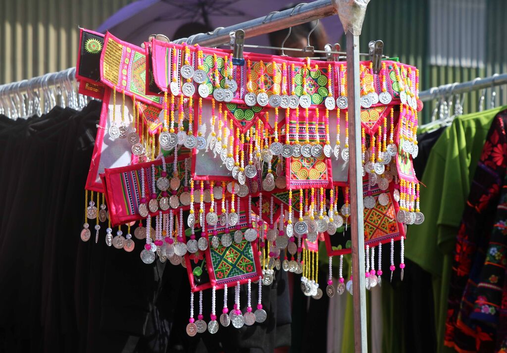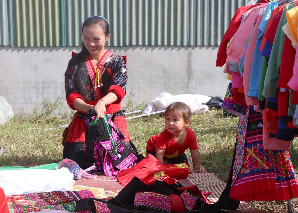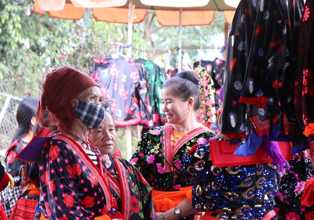 | Des femmes H’mông en tenue traditionnelle au marché. |