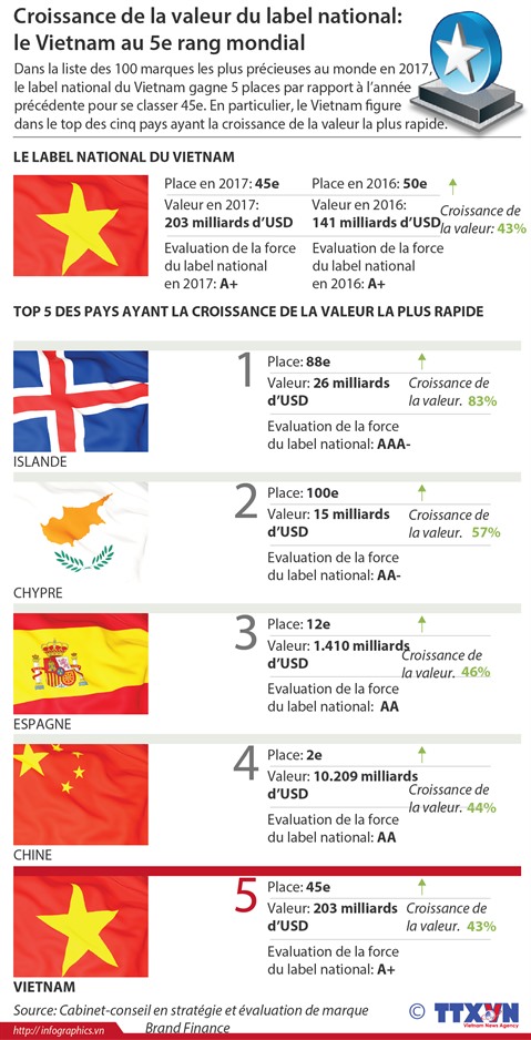 Dans la liste des 100 marques les plus précieuses au monde en 2017, le label national du Vietnam gagne cinq places par rapport à l’année précédente pour se classer 45e.