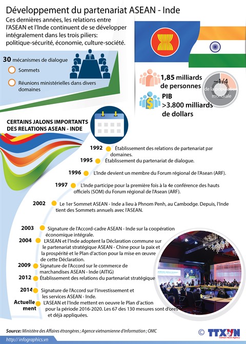 Ces dernières années, les relations entre l’ASEAN et l’Inde continuent de se développer intégralement dans les trois piliers : politique-sécurité, économie, culture-société.