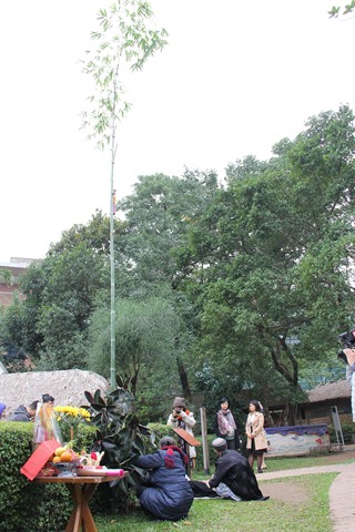 | Le dressage d’une "cây nêu" (perche rituelle du Têt), au Musée d’ethnographie du Vietnam, le 17 janvier à Hanoï. |