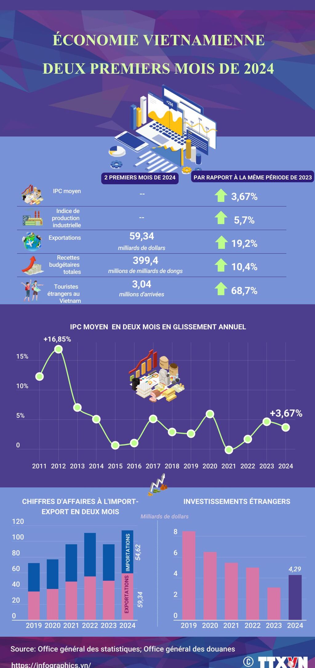 Au cours des deux premiers mois de 2024, l'économie vietnamienne montre des signes de reprise. La valeur totale des importations et exportations a atteint 113,96 milliards d'USD. Le capital enregistré total des IDE a atteint 4,29 milliards d'USD. Le nombre de visiteurs internationaux au pays s'est chiffré à 3 millions.