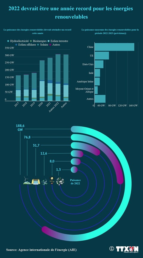 Après une année 2021 qui a vu se multiplier la création de complexes photovoltaïques ou éoliens, cette année 2022 devrait voir un nouveau record d'installation de capacités électriques renouvelables, avec 320 GW, a indiqué l'Agence internationale de l'énergie (AIE).