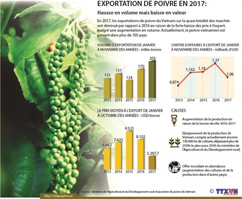 En 2017, les exportations de poivre du Vietnam sur la quasi-totalité des marchés ont diminué par rapport à 2016 en raison de la forte baisse des prix à l’export, malgré une augmentation en volume.