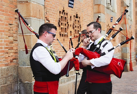 | Des joueurs de cornemuse bretons sur le parvis de l’église Notre-Dame de HCM-Ville. |