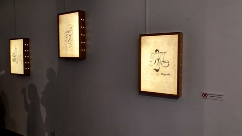 | Le "pont" du temps constitué de 27 photos en noir et blanc qui s’illuminent au contact du public. |