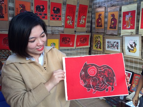 | Dans le stand des estampes populaires de Kim Hoàng. |