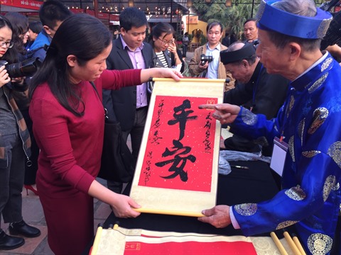 | La Fête est organisée pour honorer l’art de la calligraphie et répondre au désir des Vietnamiens de demander de beaux idéogrammes lors du Têt. |
