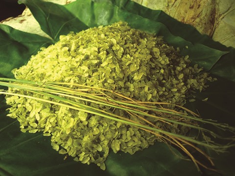 Le côm, le jeune riz gluant aux grains aplatis et parfumés, est une spécialité de la capitale en cette saison. Pour les Hanoïens, rien n’évoque davantage que la saveur du côm, avec sa couleur d’un tendre vert et son léger parfum. Et l’image de la Hanoï d’automne serait incomplète s’il n’y avait pas ce riz typique vendu dans une feuille de lotus formant un petit paquet.
