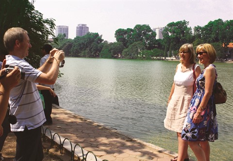 | Des touristes étrangers photographient les bords du lac de l’Épée restituée. |