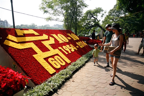 | L’inscription végétale «60 nam giai phong thu dô» (60e anniversaire de la libération de la capitale) sur l’esplanade de la statue de Lénine, rue Diên Biên Phu, aura nécessité plusieurs milliers de pots de plantes et de fleurs. |