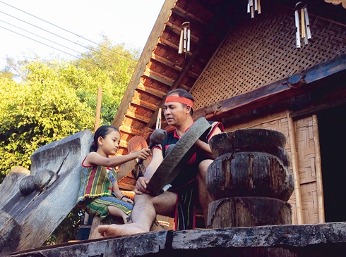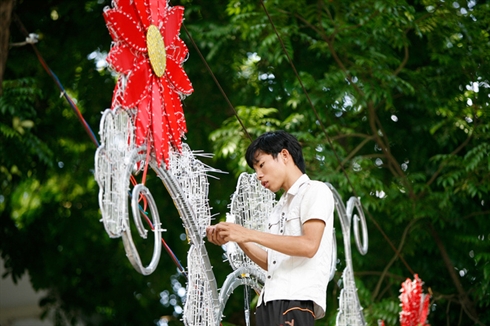 | Installation du système de guirlandes ornementales sur la rue Lê Thai Tô. |
