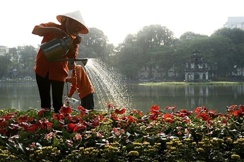 | Mention spéciale aux zones bordant le lac de l'Épée restituée (lac Hoàn Kiêm), où se dérouleront les principales activités de la célébration du 60e anniversaire de la libération de la capitale. Dans le jardin devant le temple de Ngoc Son, les paysagistes mettent la touche finale aux travaux de décoration. |