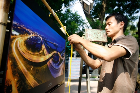| Préparatifs pour une exposition photographique sur Hanoi, au bord du lac de l’Épée restituée. |