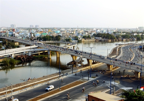 | Les infrastructures de transport de la mégapole s’enchaînent, facilitant la circulation et les échanges commerciaux. Sur la photo : le pont Nguyên Van Cu et le boulevard Vo Van Kiêt (Périphérique Est-Ouest)