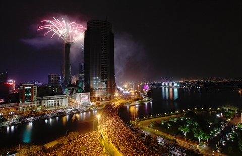 | La population se régale des feux d'artifice tirés lors du Nouvel An en centre-ville. Photo : Quang Nhut/VNA/CVN