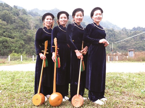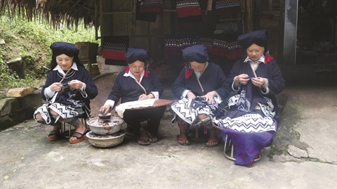 | Des femmes Dao Tiên méticuleuses dans la broderie à la cire d’abeille sur le tissu de brocart. |