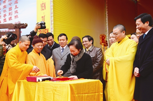 | La vice-présidente de la République, Nguyên Thi Doan, exécute le rite d'apposition du sceau qui marque l'ouverture officielle de la fête de Yên Tu. |