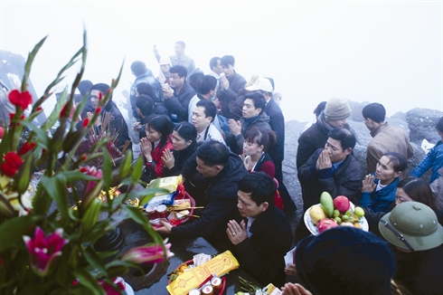 | D'innombrables pèlerins présentant leurs offrandes très tôt à la pagode en bronze, au sommet du mont Yên Tu |